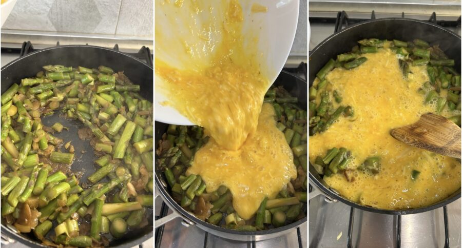 Preparo dos ovos mexidos com aspargos