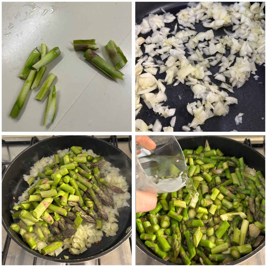 Quanto à parte descartada, que seria mais dura, você pode descascá-la, aproveitar o miolo e usá-lo junto com o resto dos aspargos. Depois, descasque a cebola, lave-a, pique-a e refogue com um pouco de azeite. Quando estiver murcha, adicione os aspargos, deixe pegar sabor, ajuste o sal, coloque um copo de água e cozinhe, mexendo quando necessário.