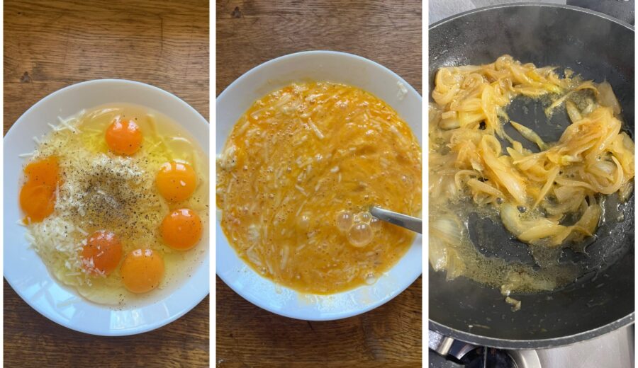 Quebre os ovos em uma tigela junto com o queijo ralado e um pouco de pimenta; bata grosseiramente com um garfo e despeje sobre as cebolas já cozidas.