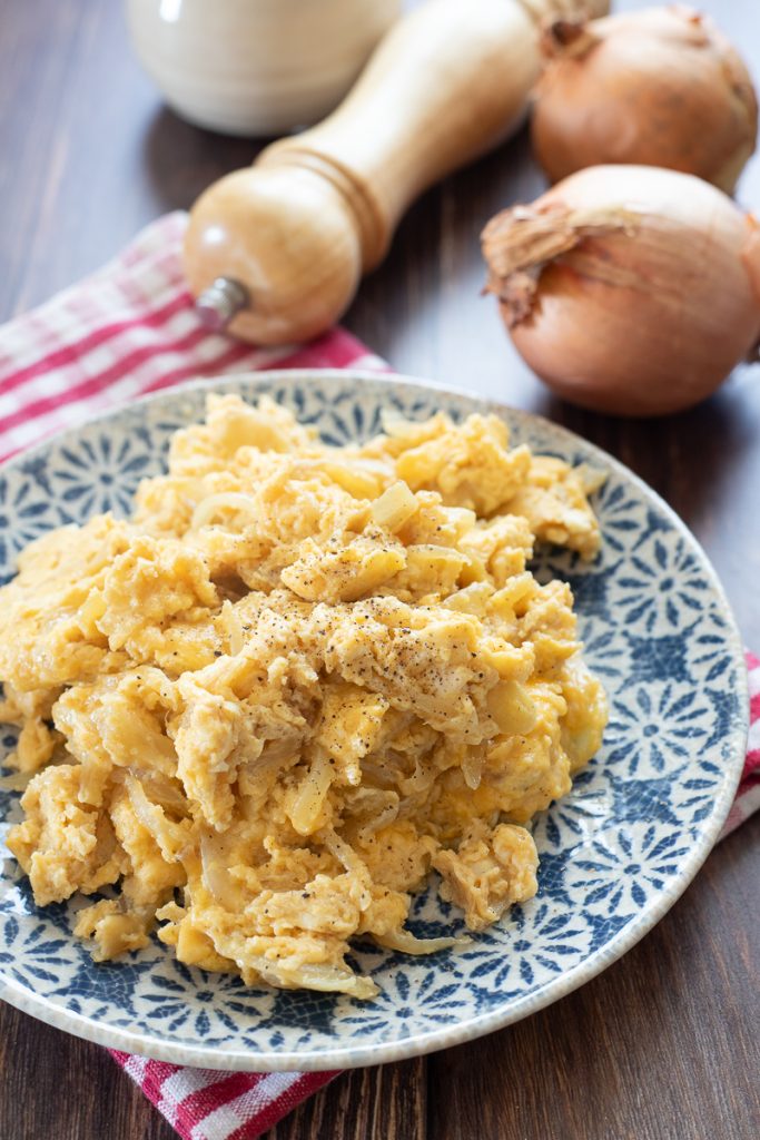 Ovos mexidos com cebolas e queijo. Se você gosta de ovos mexidos e adora as cebolas, não pode perder a receita de ovos mexidos com cebolas, quase uma omelete de cebola, mas com menos stress e um prato principal salva jantar vencedor! Os ovos, como sabemos, são baratos, versáteis e perfeitos em qualquer ocasião, do brunch ao clássico café da manhã americano, são gostosos tanto no almoço quanto no jantar, sozinhos, em salada ou sobre pão fresco. Há algum tempo compartilhei com vocês um pequeno tutorial sobre Como cozinhar ovos, expliquei como cozinhar os clássicos ovos cozidos, os ovos cozidos molinhos, passando depois pelos ovos fritos e as fritadas. Todas são preparações que cada um de nós deveria saber fazer, inclusive os ovos mexidos ao estilo americano. Mas você já tentou fazer ovos mexidos com queijo ralado e cebolas? Se ainda não provou, precisa experimentar, porque os ovos mexidos com cebolas são uma ideia super rápida, gostosa e econômica para um jantar ou almoço de última hora e uma verdadeira receita econômica para o jantar que vai agradar a todos! Vamos para a cozinha agora, eu conto como fazer esses ovos com cebolas e queijo, mas antes lembro que se quiser ficar atualizado sobre novas receitas você pode seguir minha página Facebook e meu perfil Instagram.