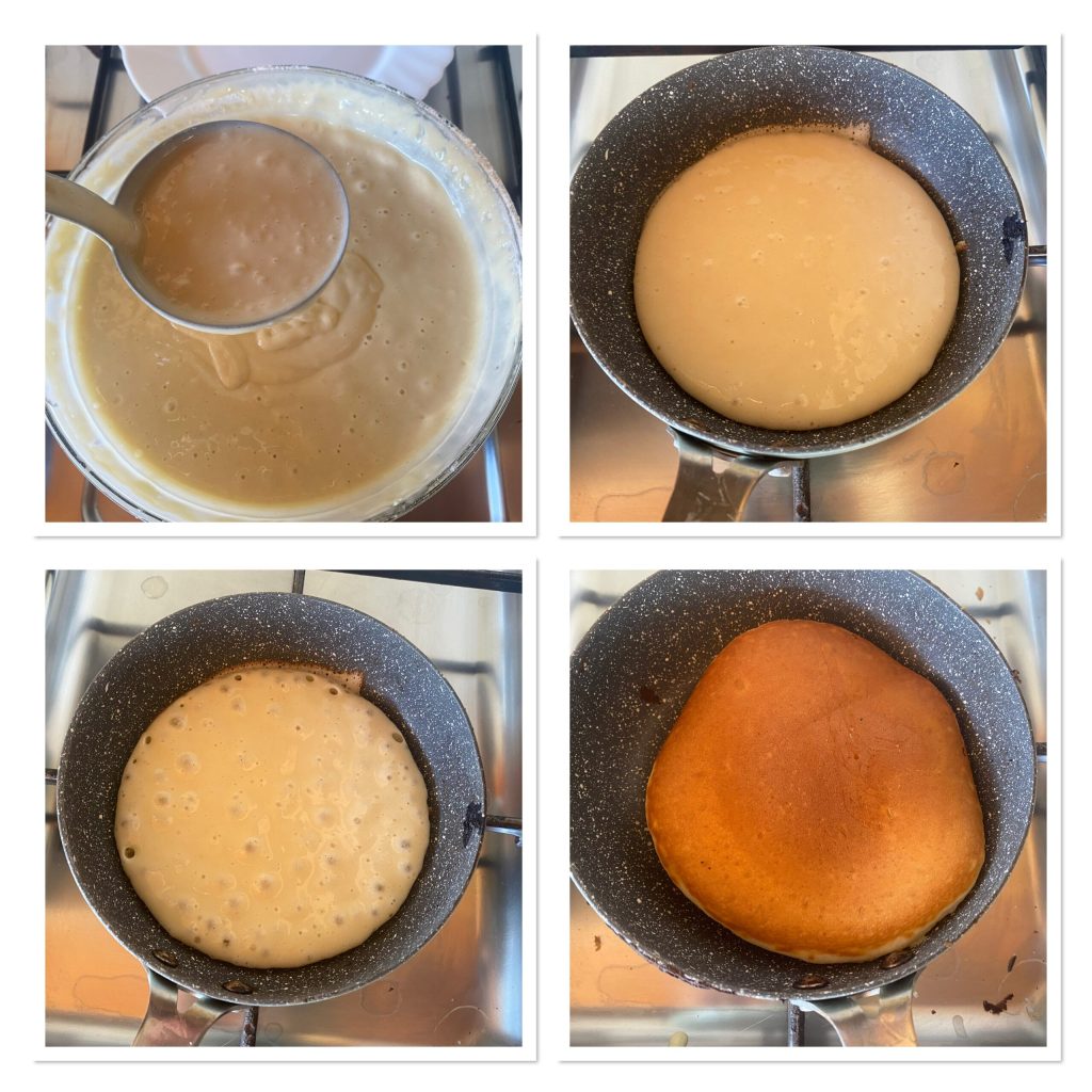 • Unte uma frigideira pequena, mesmo antiaderente, aqueça bem e coloque meia concha da massa, mas claro que tudo depende do tamanho da sua frigideira. Cozinhe em fogo baixo por cerca de dois minutos; assim que aparecerem bolhinhas na superfície, vire e cozinhe pelo mesmo tempo ou um pouco menos do outro lado. Empilhe as panquecas umas sobre as outras, elas vão ficar quentinhas; depois sirva, por exemplo, com mel, xarope de bordo, creme de avelã, frutas e tudo o que gostar.
