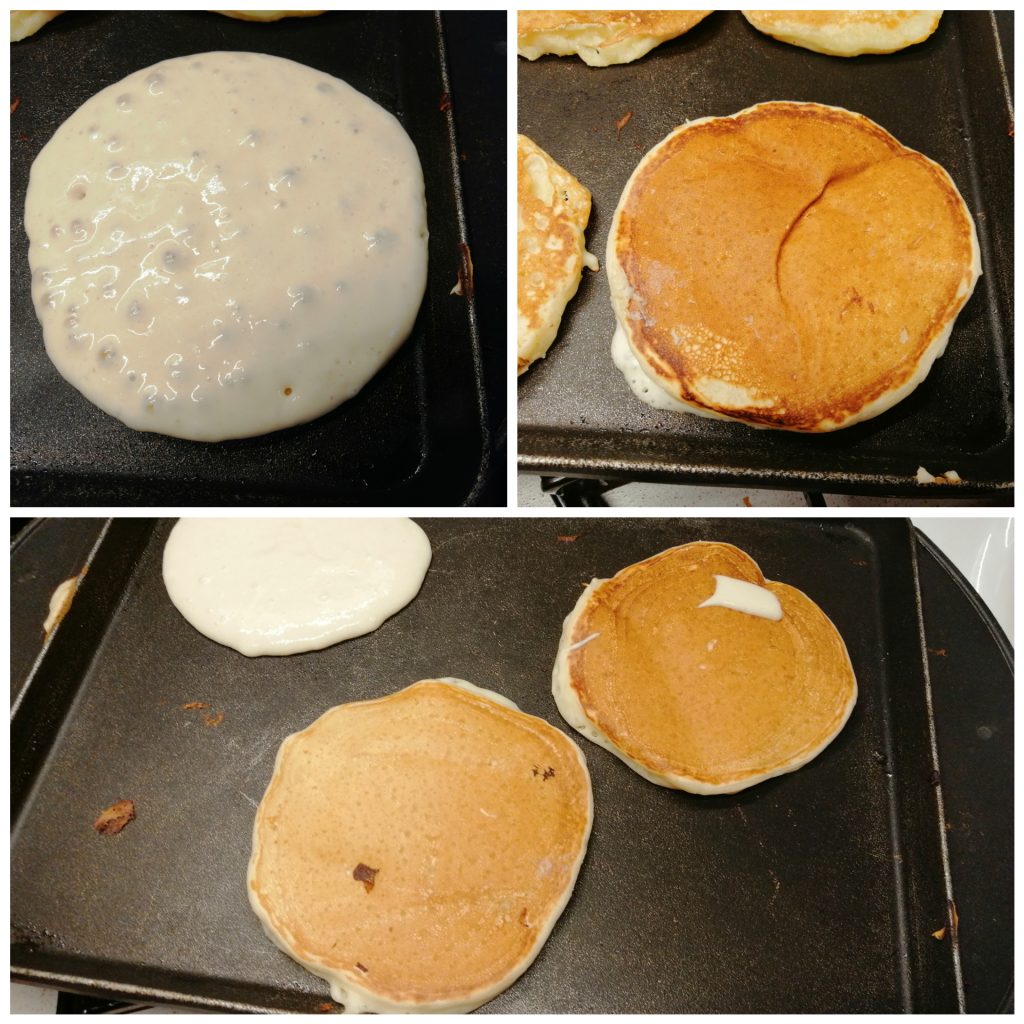 Depois de colocar na frigideira, espere que apareçam muitas bolhas e, com a ajuda de uma espátula, vire.