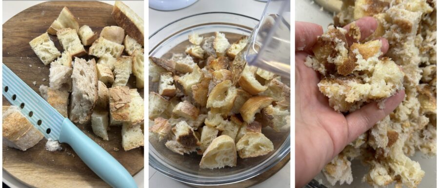 Corte o pão amanhecido em pedaços, coloque numa tigela e despeje a água e o vinagre; quanto ao vinagre limite-se à dose indicada, já a quantidade de água você pode aumentar. Deixe descansar tudo por uns vinte minutos, então esfarele grosseiramente.