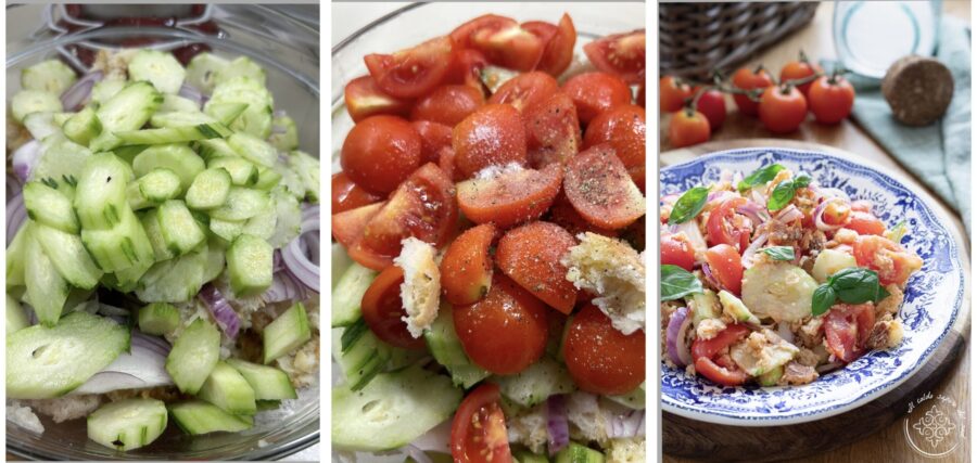 A panzanella deve ser preparada de manhã para o almoço e à tarde para o jantar e guardada na geladeira, mas fica ótima também no dia seguinte. Se você não gosta do sabor forte da cebola, coloque-a numa tigela, adicione meia colher de sopa rasa de sal e 50 ml de vinagre, misture e deixe descansar 10 minutos, então enxágue bem e escorra — você verá que ela vai perder grande parte da sua água de vegetação e do cheiro pungente, ficando mais doce.