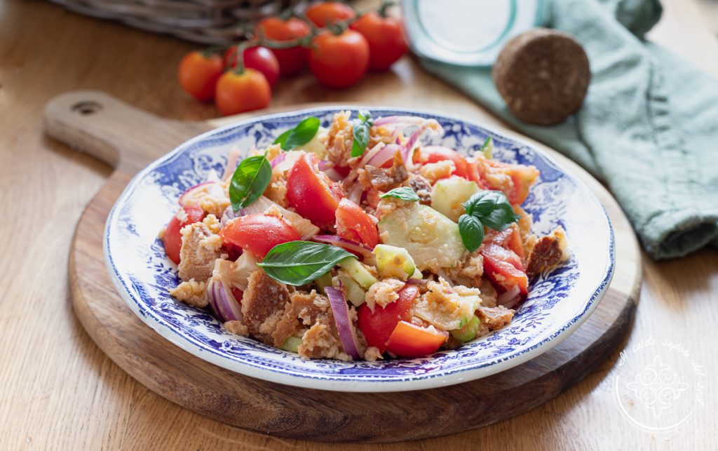 Panzanella toscana, a receita da vovó e um clássico do reaproveitamento. A panzanella é um prato simples e humilde, fresco e muito saboroso, típico da Toscana e do centro da Itália, uma receita mediterrânea, vegana e vegetariana, perfeita para o verão. Feita com pão caseiro amanhecido e legumes da estação, a panzanella é a melhor receita para não desperdiçar o pão velho, uma das Receitas de verão para o jantar que eu mais gosto e preparo com frequência. Tomates, pepino e cebola roxa nunca faltam no verão, e se você também tiver pão amanhecido e um bom azeite, pronto — a nossa sopa fria de verão está feita! Vamos pra cozinha, eu conto como fazer a panzanella clássica da vovó, mas antes, como sempre, lembro que se quiser ficar por dentro de todas as minhas receitas, você pode seguir minha página no Facebook (aqui) e meu perfil no Instagram (aqui).