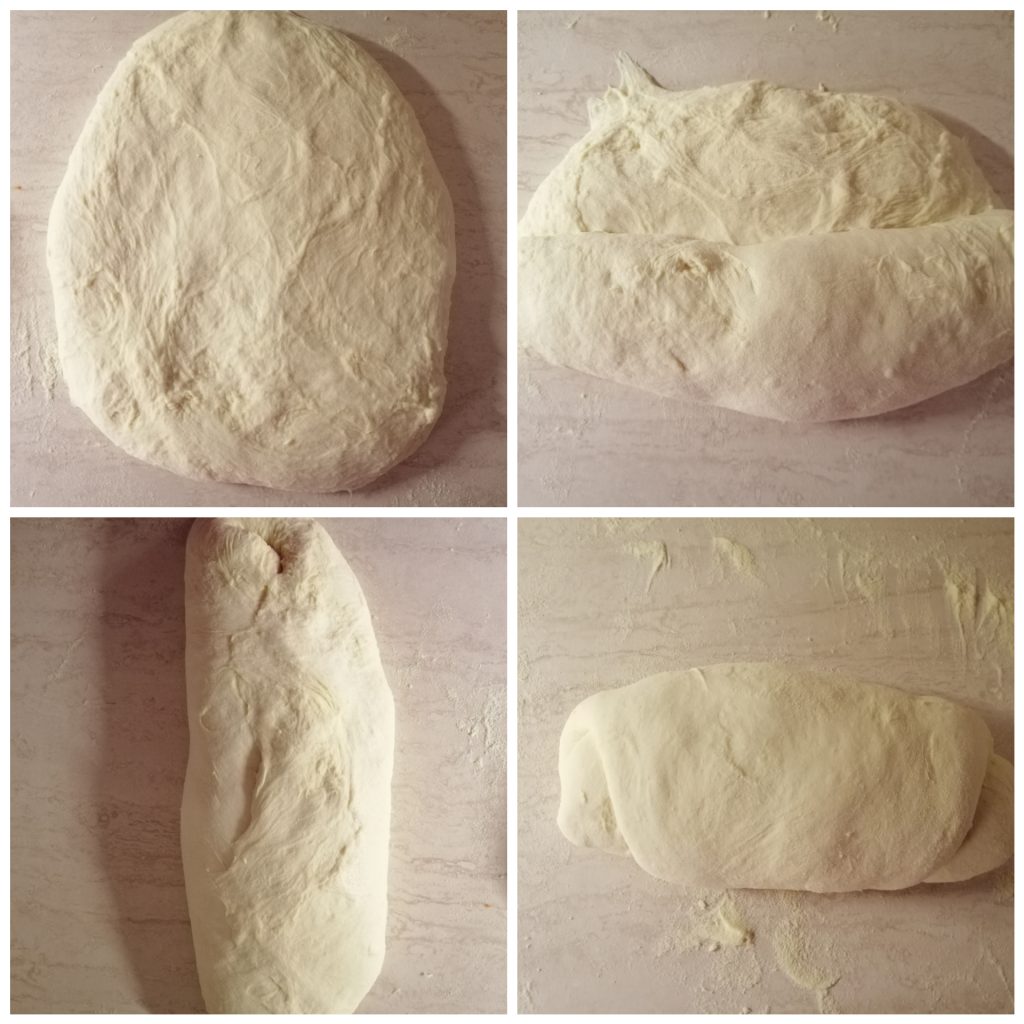 Enfarinhe bem a superfície de trabalho, abra a primeira peça e enrole sobre si mesma formando um cilindro; gire o cilindro 90°, posicione-o com o lado curto voltado para você, abra um pouco e enrole novamente bem apertado.
