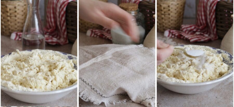 Misture grosseiramente, cubra com um pano e deixe descansar 10 minutos. Passado o tempo, junte o sal e o restante da água,
