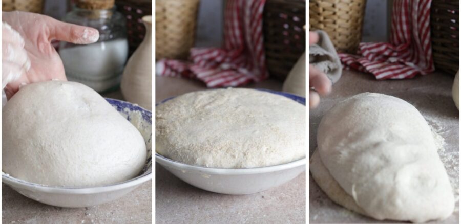 Coloque a massa em uma tigela, cubra e deixe em um lugar morno por 2h. Passado o tempo, a massa terá crescido um pouco, levantando-se pelo menos 2 cm da tigela (no inverno pode demorar mais). Vire-a então sobre a bancada enfarinhada, faça um giro de dobras e divida em duas metades.
