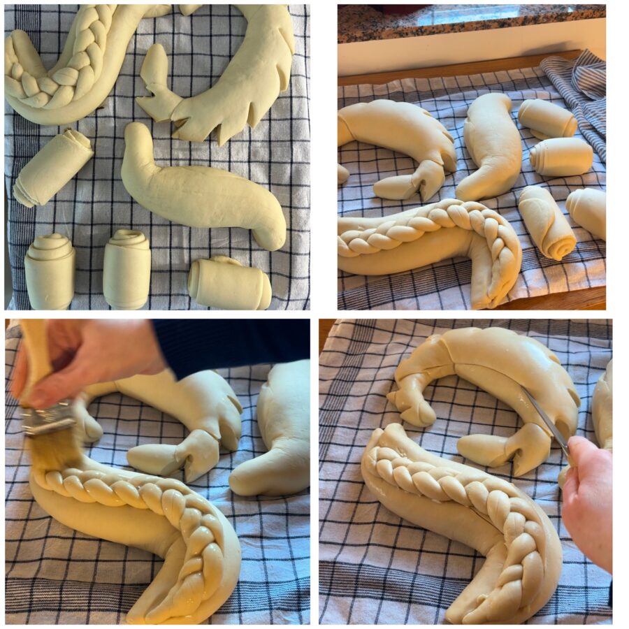 Crie uma trança de massa, umedeça levemente o filão no ponto da dobra, coloque a trança por cima e modele em “S“. Passe para as formas seguintes que você vê nas fotos,
