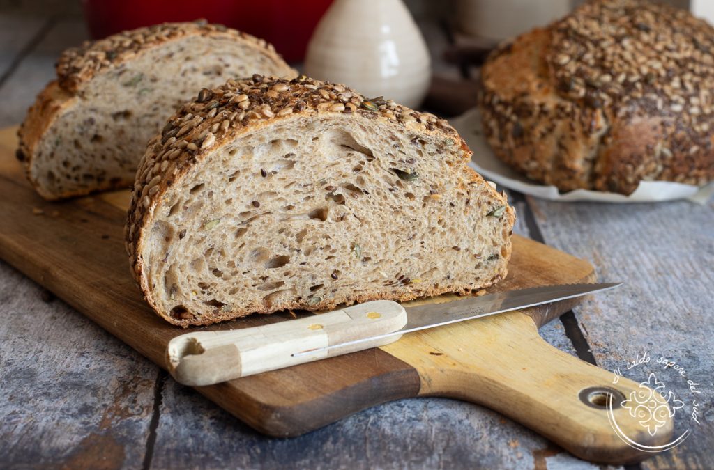 Pão rústico com sementes e farinha Tumminia integral, um pão semi-escuro com grãos antigos sicilianos, sêmola remacinada e fermento natural, delicioso. Eu amo o pão feito em casa, especialmente se feito com fermento natural. Adoro sovar e o pão integral de grãos antigos da Sicília é um dos meus preferidos. Alguns anos atrás fui de férias na Alemanha e conheci lá o primeiro pão preto; me apaixonei no primeiro pedaço e, quando voltei para a Sicília, tentei recriá-lo usando as nossas farinhas. Assim aprendi a fazer pães ótimos, exatamente como este pão semi-integral com farinha de Tumminia (timilia) e sêmola remacinada. Um pão com fermento natural e alta hidratação, perfumado, crocante e delicioso que eu assei na panela, com a técnica geladeira-forno. Querem experimentar também? Vamos para a cozinha! Mas, como sempre, lembro que se quiserem ficar atualizados sobre todas as minhas receitas, podem seguir minha página no Facebook (aqui) e meu perfil no Instagram (aqui).