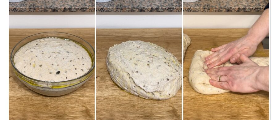 Passado o tempo, divida o pão conforme a capacidade das cestas e comece as dobras. Eu usei duas cestas de 1 kg e dividi a massa ao meio. Abra a massa sobre a bancada formando um retângulo e enrole-a sobre si mesma criando um cilindro.