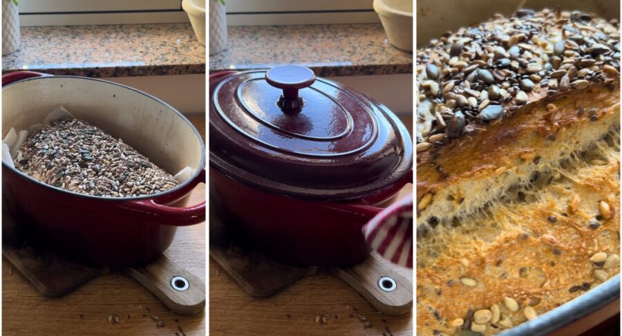 Quando o pão tiver dobrado de volume — nunca antes — ligue o forno a 250°C (ou na temperatura máxima) e coloque a panela dentro com a tampa.