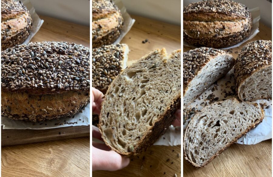 Continue sovando até a massa estar formada e perfeitamente emcordada — isso deve levar cerca de vinte minutos. Junte 150 g de sementes mistas e incorpore-as à massa.