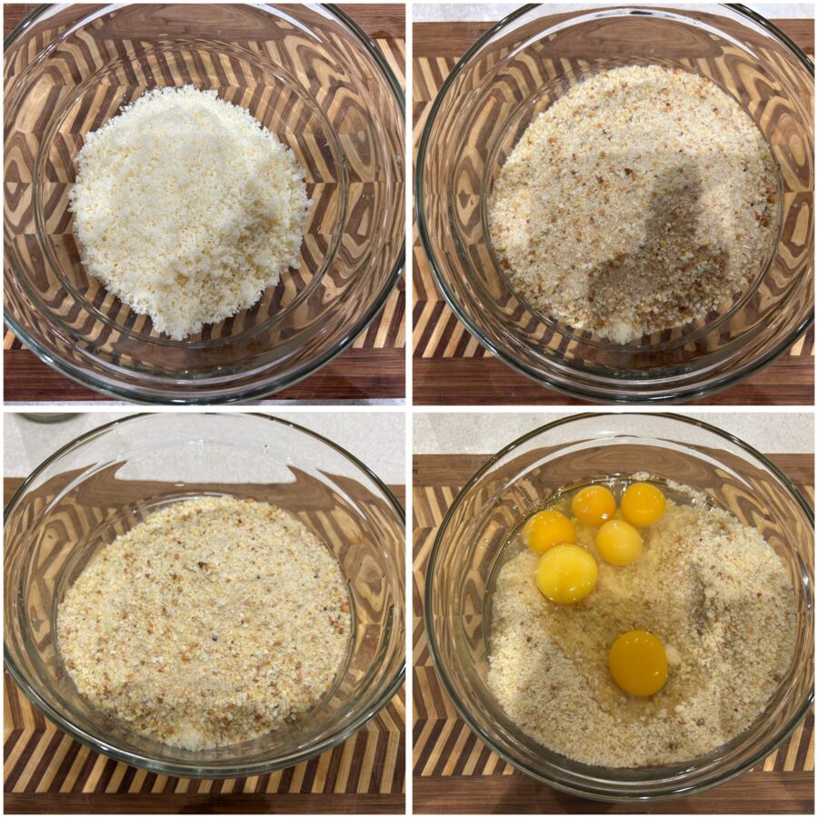 • Para fazer os passatelli tradicionais, comece juntando numa tigela grande o pão ralado e o parmesão ralado. Misture bem para distribuir uniformemente os ingredientes secos, assim você terá uma base homogênea.