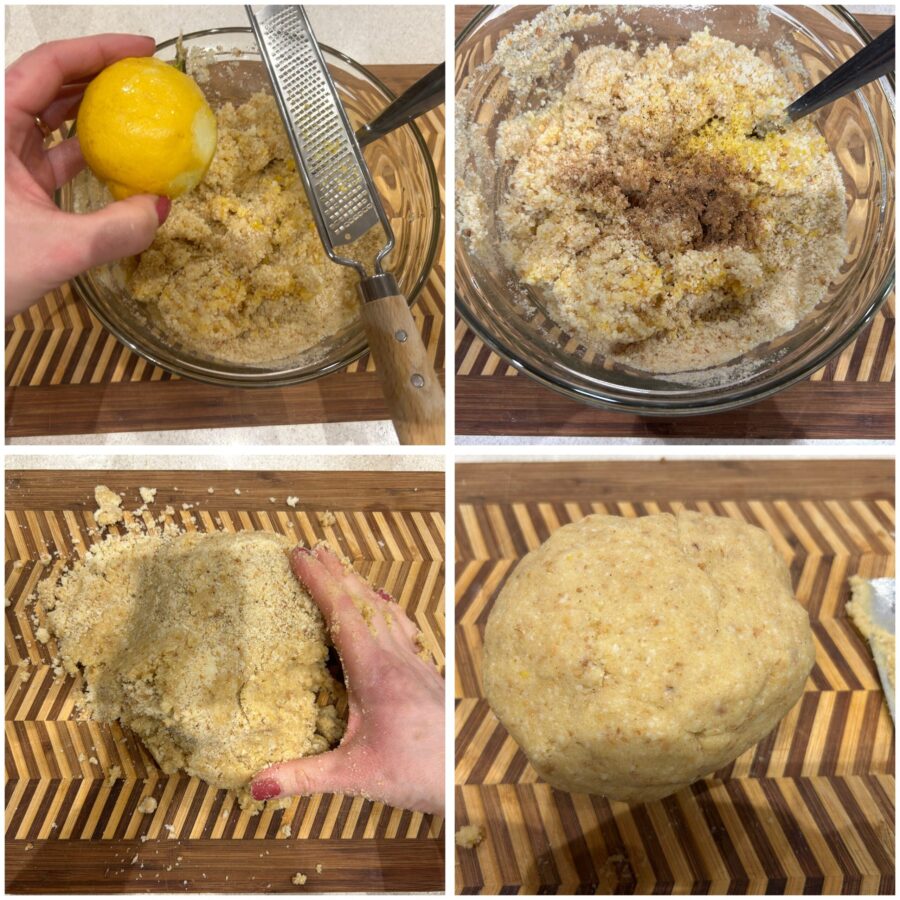 • Continue trabalhando até obter uma massa compacta porém ainda macia. Transfira a massa para a bancada e amasse rapidamente com as mãos, sem acrescentar farinha. Forme uma bola lisa, envolva-a em filme plástico e deixe descansar na geladeira por pelo menos 30 minutos.