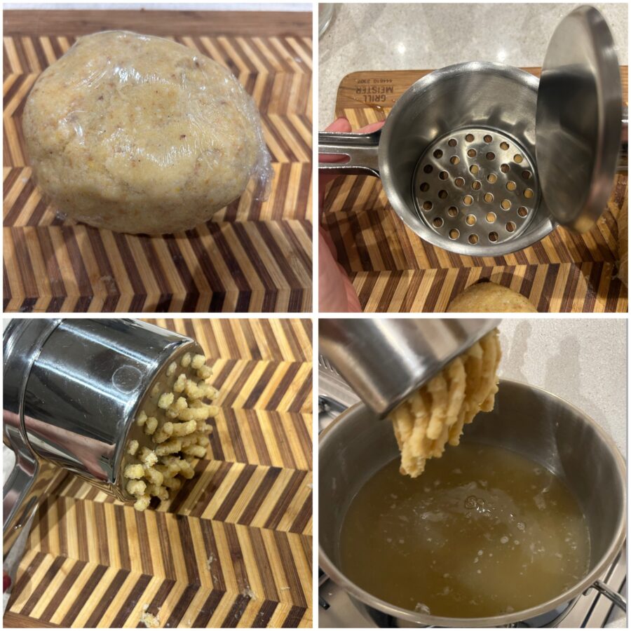• Passado o tempo de descanso, deixe a massa voltar um pouco à temperatura ambiente por alguns minutos. Pegue uma porção e coloque-a no espremedor com furos largos ou no ferro apropriado para passatelli.
