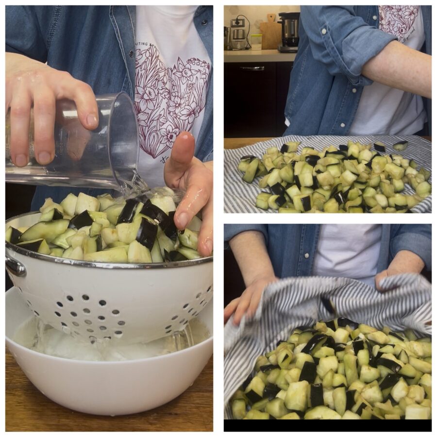• Lave as berinjelas e escolha se vai descascá-las ou não, corte-as em cubos ou em fatias, coloque-as em uma tigela, polvilhe com um punhado de sal e deixe descansar por 30 minutos. Enxágue, esprema e seque com um pano de cozinha,