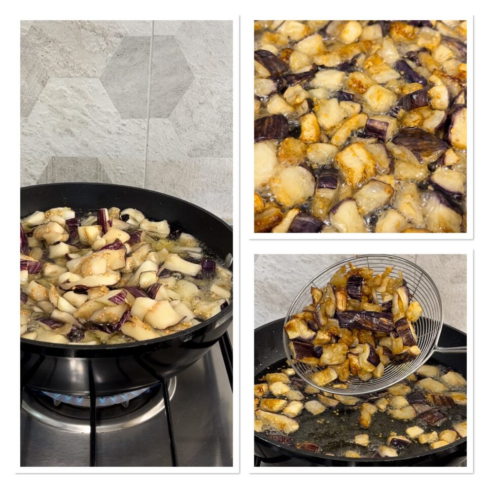 Para a preparação da passata de tomate, consulte a receita da passata caseira; em alternativa, compre uma de boa qualidade. Depois, dedique-se às berinjelas, que você pode fritar em fatias como se fazia antigamente, ou cozinhar em cubos por conveniência. A passata deve, de qualquer forma, ser ajustada de sal; devem ser adicionados um ou dois dentes de alho amassados, deixada reduzir no fogo e temperada fora do fogo com azeite e manjericão.