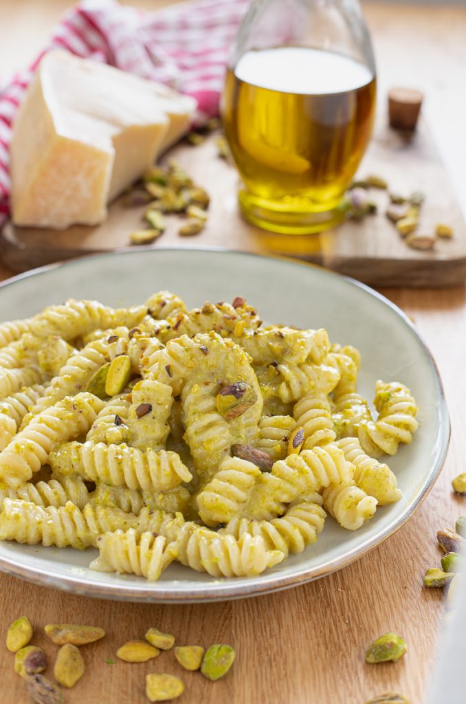 Para fazer o pesto de pistache usei pistaches dessalgados; recomendo os de Bronte, são um pouco caros, mas o sabor é único. Torre-os na frigideira por alguns minutos, mexendo sempre e tomando cuidado para não queimar. Deixe esfriar e coloque no copo do liquidificador junto com o azeite, o queijo (ralado ou em pedaços tanto faz) e o alho. Bata até obter um molho homogêneo, prove e ajuste o sal se necessário. O pesto está pronto e pode ser usado para temperar massa, bruschettas e muito mais, mas aqui vamos usar para temperar fusilli.