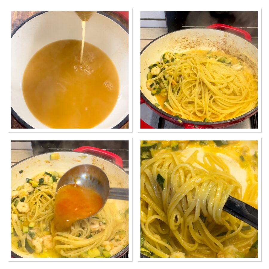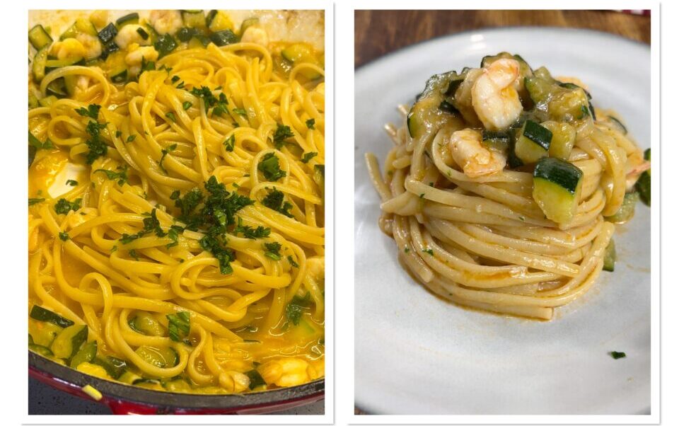 • Com a bisque pronta, leve-a novamente ao ponto de fervura. Cozinhe as linguine e escorra ainda bem, bem al dente, coloque uma concha de bisque na panela com os camarões e as abobrinhas, junte a massa e termine o cozimento colocando o resto da bisque aos poucos, deixando que seja absorvida antes de acrescentar mais.