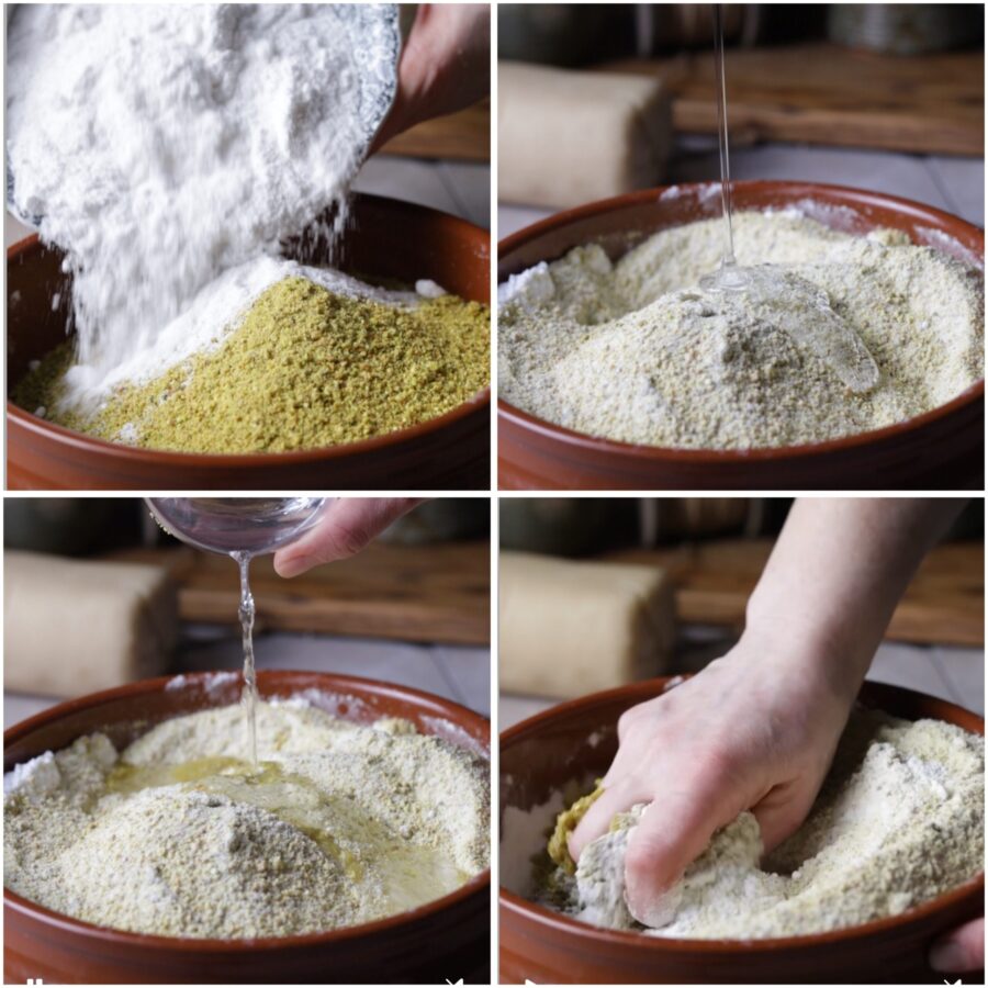 • Misture tudo e comece a trabalhar vigorosamente com as mãos, para que a farinha de pistache libere o óleo e o açúcar, ao se dissolver, deixe a massa mais maleável. Não adicione mais água; sove até obter uma massa plástica e modelável.