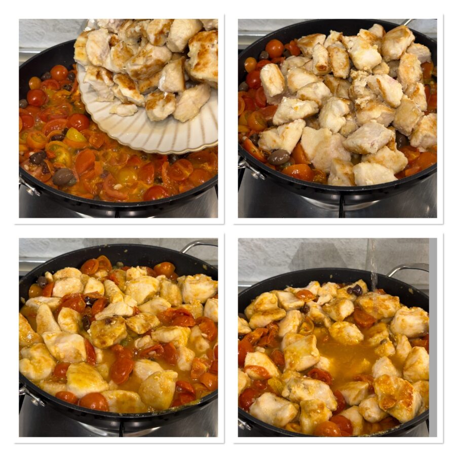 • Cozinhe por alguns minutos e adicione os pedaços de frango, misture e despeje o vinho branco.