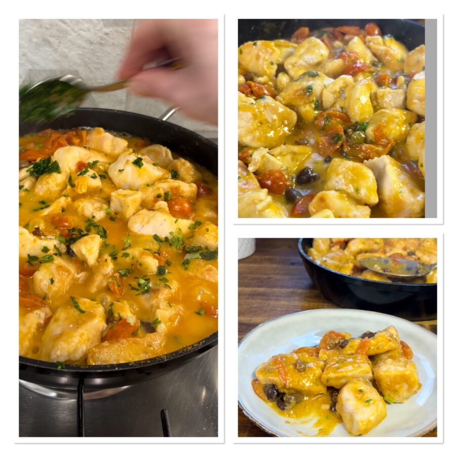 Pedaços de frango à mediterrânea na frigideira. Fácil, rápido e saboroso, o peito de frango à mediterrânea, cozido na frigideira é um segundo prato delicioso, econômico e caprichado que você precisa experimentar, se não sabe Como cozinhar o frango. Assim como as coxas de frango à mediterrânea na frigideira com azeitonas pretas e tomates secos ou o salmão à mediterrânea, este prato delicioso é simples de fazer, fica pronto em poucos minutos e é perfeito se você quer levar à mesa um jantar rápido e saboroso sem estresse. Você pode preparar o peito de frango à mediterrânea tanto com o peito em fatias quanto com o peito em pedaços, o procedimento é o mesmo e o resultado garantido. Tomatinhos, uvas-passas, alcaparras, azeitonas taggiasche e pinhões vão deixar seu peito de frango saboroso e suculento e a passagem da carne pela farinha permitirá ao final do cozimento um segundo cremoso, envolvente e delicioso! Quer tentar também cozinhar o frango à mediterrânea do mesmo jeito? Vamos para a cozinha, separe todos os ingredientes e mãos à obra. Antes, só lembrando que se quiser ficar atualizado sobre todas as minhas receitas, pode seguir minha página no Facebook (aqui) e meu perfil no Instagram (aqui).
