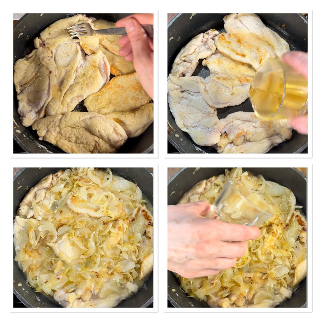 Peito de frango com cebolas e vinho branco, super macio, delicado e cremoso, uma receita que explica como cozinhar o frango para que ele fique úmido e macio — e é uma ótima opção para a nossa coleção de receitas com cebola. Se você está cansado do mesmo peito de frango grelhado e procura uma ideia para um peito de frango gostoso, então você está na página certa, porque hoje vamos preparar juntos escalopes de frango com cebolas brancas, cremosos, delicados e muito macios, uma receita deliciosa como as Escalopes de peito de frango ao limão ou os Escalopes de frango cremosos com cogumelos. Esta receita para fazer o peito de frango na frigideira, de forma que fique úmido, bem macio e saboroso, é da minha prima Linda: alguns dias atrás ela serviu no almoço e eu gostei tanto que decidi reproduzir. A receita do peito de frango com cebolas e vinho branco é super simples, rápida, econômica e deliciosa, e é a solução para preparar o jantar em poucos minutos, por exemplo quando você chega do trabalho e falta a ideia certa para um jantar rápido. Pronto para correr para a cozinha? Vamos lá, a nossa receita rápida e saborosa com peito de frango te espera, mas antes lembro que se você quiser ficar por dentro de todas as minhas receitas, pode seguir minha página no Facebook (aqui) e meu perfil no Instagram (aqui).