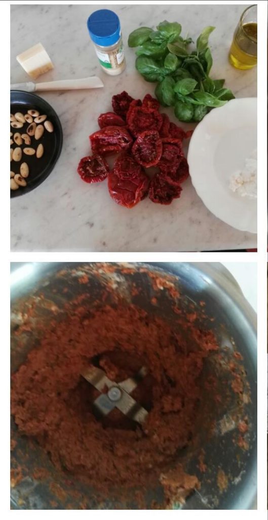 Quando o verão avança e o sol fica mais forte, na Sicília, como em muitas outras regiões, começa-se a preparar os tomates secos, com os quais se fazem muitas delícias, entre elas o Patê de tomates secos com amêndoas e nozes, Tomates secos recheados, o Pão de sêmola com tomates secos e muito, muito mais! Visto que os tomates secos podem ser consumidos de várias maneiras, como não incluir entre elas o pesto à siciliana? Uma receita tradicional à base de tomates desidratados, amêndoas, óleo e queijo que, enriquecida pelo aroma fresco e veranil do manjericão, vira um ótimo tempero para pão, bruschettas e, principalmente, Maccheroni al ferretto e busiate trapanesas.