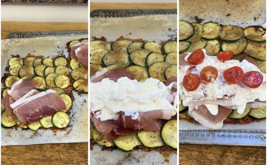 Asse em forno pré-aquecido a 200°C por cerca de 30 minutos ou até dourar. Quando estiver bem gratinado, verá que o queijo terá liberado sua parte gordurosa no fundo da assadeira; escorra ou absorva com papel toalha. Deixe amornar ou esfriar antes de desgrudar delicadamente as piadinas de abobrinha da assadeira, depois transfira para um prato com o lado sem queijo virado para cima. Recheie como preferir (embora sejam gostosas também sozinhas); eu escolhi speck, burrata, tomatinhos e rúcula e dobrei em formato de carteira.