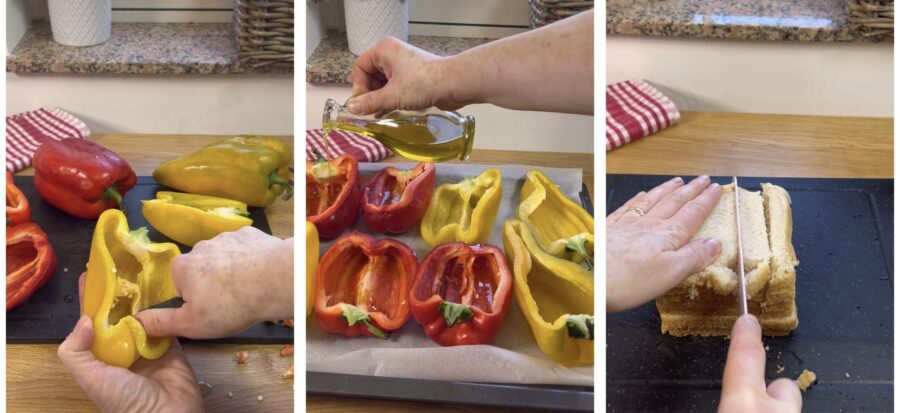 Corte-os ao meio e remova sementes e fiapos, disponha-os em uma assadeira adequada ao tamanho, pincele com azeite, polvilhe com um pouco de sal e leve ao forno por 15–20 minutos a 200°C em modo estático. Pique o pão ou o miolo e coloque-o em uma tigela junto com