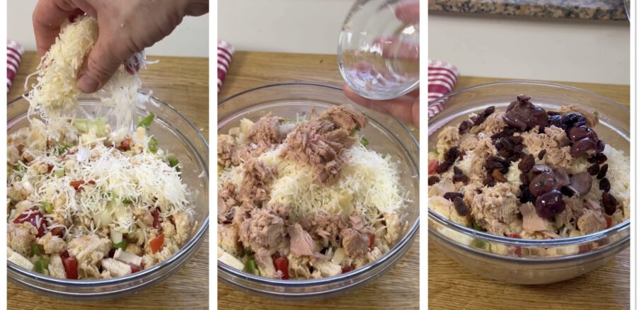 • Misture, depois continue adicionando o queijo, o atum escorrido, a uva passa, as azeitonas, as alcaparras, os pinhões,