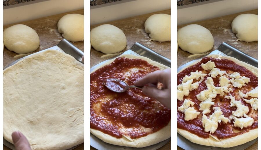 Transfira o disco de massa para a pá enfarinhada e então cubra com o molho de tomate (já cozido e ajustado de sal) e a muçarela.
