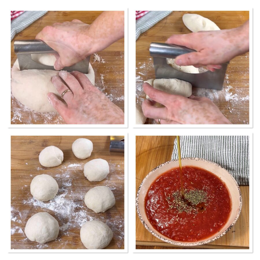 Depois que dobrar — não antes — divida a massa em pedaços e faça bolinhas de 100 g para pizzinhas maiores ou de 50 g para pizzinhas mini.