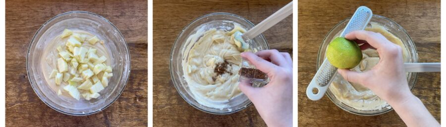 • Adicione a maçã à massa, junto com a canela, o cravo-da-índia moído e as raspas de limão.