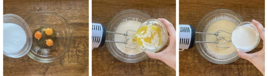 • Comece batendo os ovos com o açúcar, depois adicione a manteiga derretida e o creme de leite.