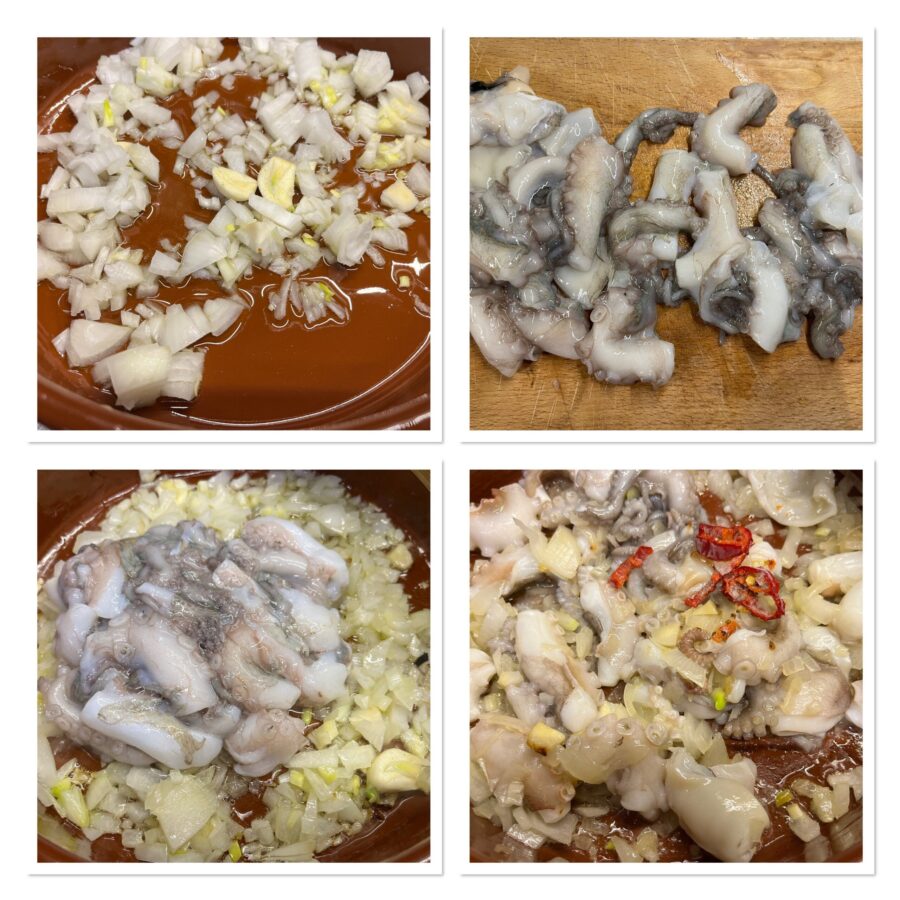 Limpe o polvo, que deve ser fresco, removendo as vísceras e o bico, ou peça ao seu peixeiro para fazer isso. Enxágue em água corrente e corte em pedaços. Descasque, lave e pique a cebola e coloque na panela junto com o dente de alho descascado e cortado ao meio, dê uma boa regada de azeite e deixe murchar.