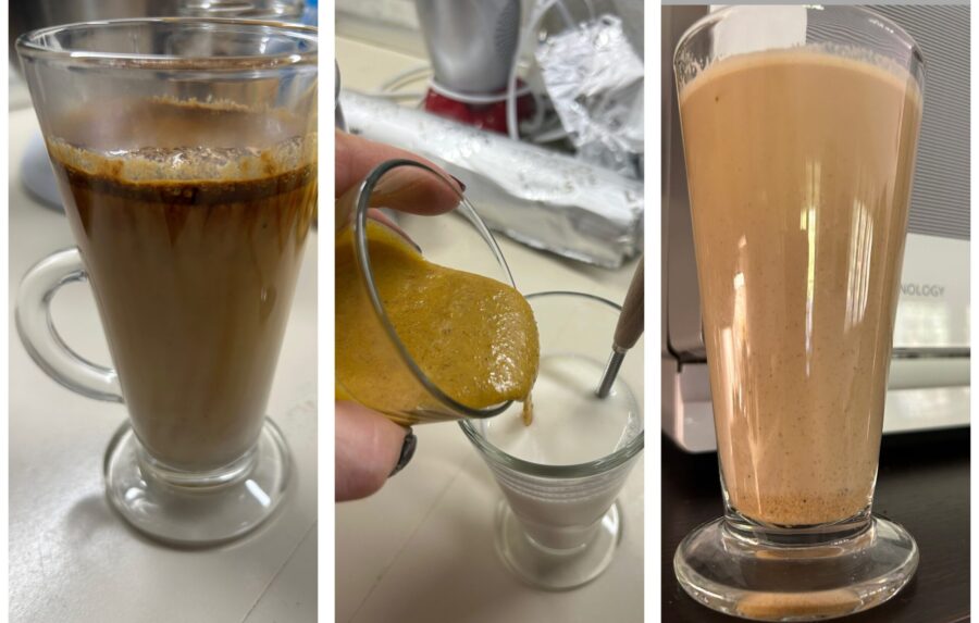 Se você já preparou o xarope de abóbora com leite condensado, vai ser rapidinho e, quando quiser, você fará um ótimo pumpink spice latte: basta aquecer uma xícara de leite, acrescentar o café espresso ou solúvel, o xarope, mexer e finalizar com um monte de chantilly e uma polvilhada de especiarias. Esta é a versão que eu recomendo; como alternativa você pode aquecer o leite, colocar uma colher de polpa de abóbora batida, uma colher de açúcar, o café solúvel ou espresso e aromatizar tudo com canela em pó, cravo em pó, noz-moscada em pó e uma pitada de gengibre em pó. Misture tudo e finalize com chantilly e uma pitada de canela.