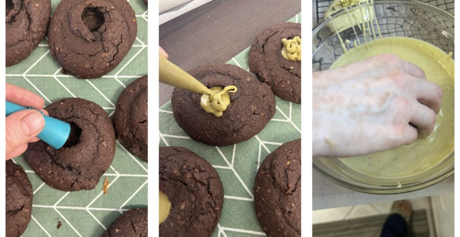 Com a massa pronta, dedique-se ao chocolate. Se quiser rechear as rame di Nápoles com creme de pistache, como eu fiz, ou com Nutella, assim que as rame estiverem frias faça uma cavidade no centro de cada uma, mas sem furar até o fundo. Coloque em cada buraco um pouco de creme e leve ao congelador por 20 minutos.