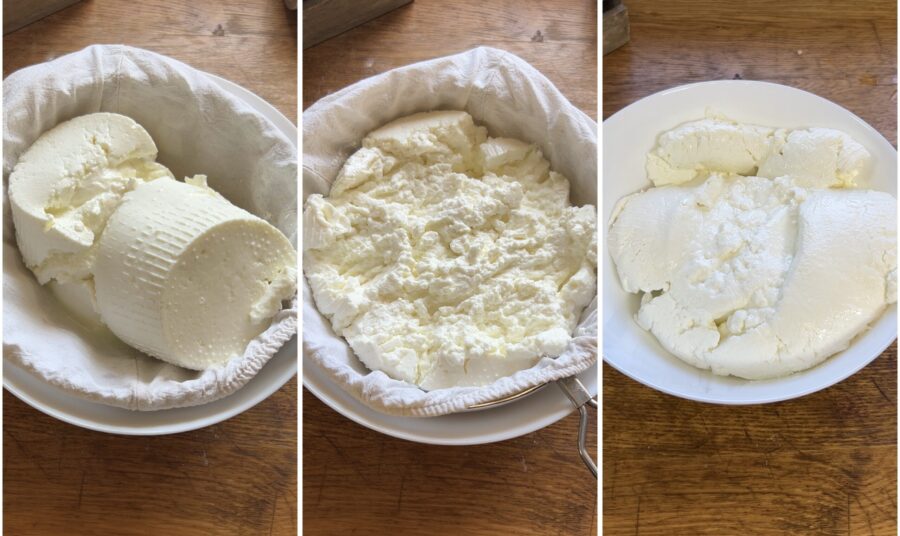 Coloque a ricota seca e bem escorrida em uma tigela. Se não estiver bem seca, forre uma peneira com um pano, coloque a ricota e deixe escorrer durante a noite, bem coberta com filme plástico e na geladeira.