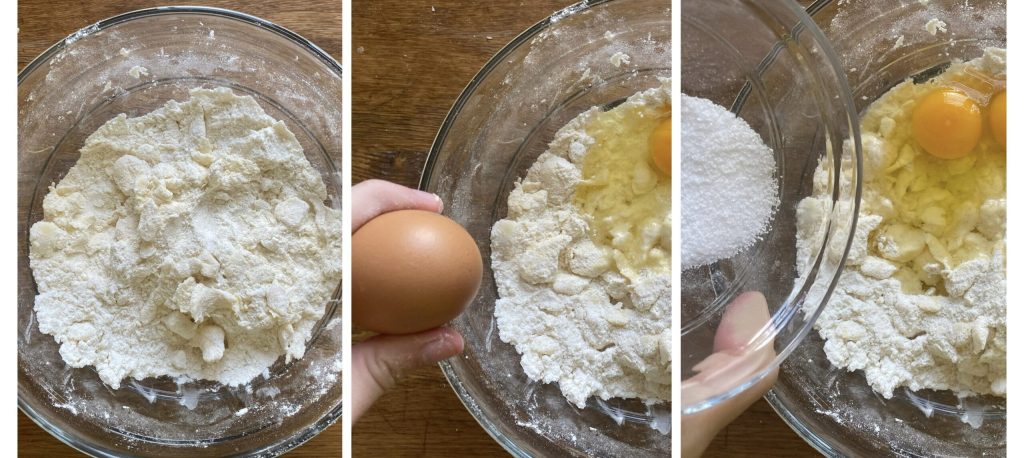 Em uma tigela grande, junte 350 gramas de farinha, o açúcar, a manteiga e o fermento para bolos