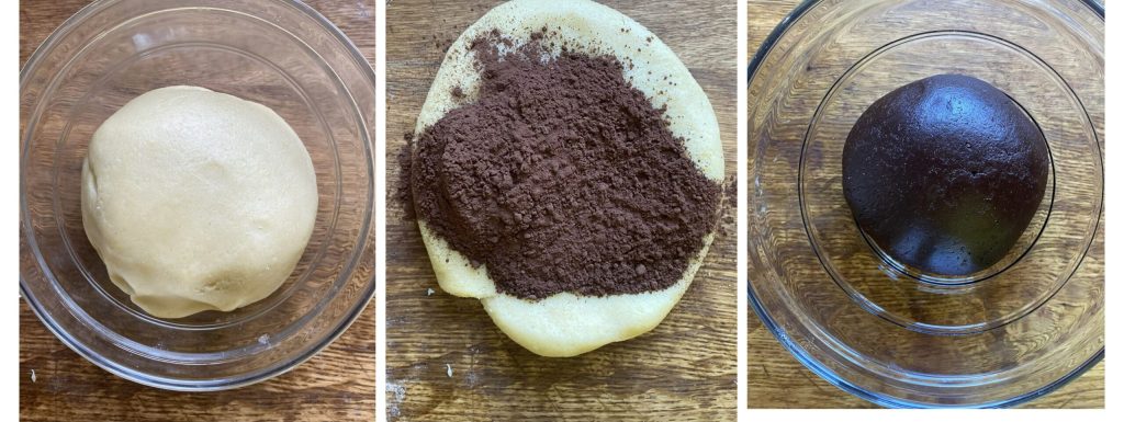 A massa obtida deve ficar relativamente homogênea e trabalhável. Divida-a em duas metades, certificando-se de pesar corretamente as 2 metades. À uma delas adicione os outros 30 gramas de farinha; essa será a metade clara.