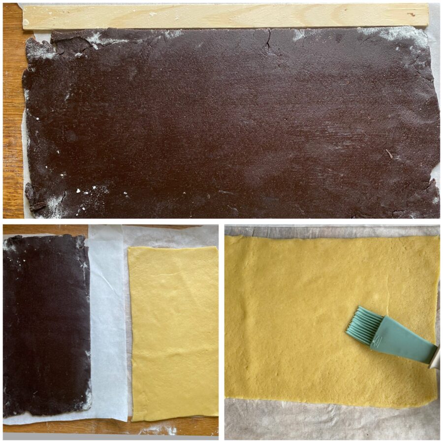 Após cerca de 30-40 minutos, retire as massas da geladeira. Comece abrindo a metade clara em um retângulo com aproximadamente 3 mm de espessura.
