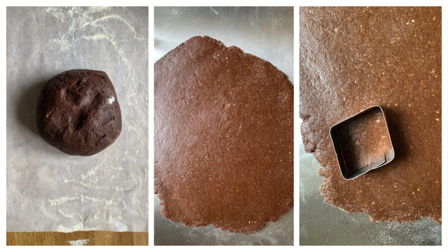 Leve à geladeira por cerca de 1h ou um pouco menos, coberta com filme plástico. Depois do descanso, a massa ficará mais macia e então será fácil de abrir. Polvilhe levemente a bancada com farinha e, com um rolo, abra uma folha de massa com pouco menos de 1 cm de espessura.