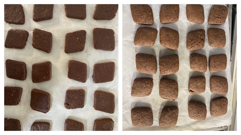 Coloque os biscoitos em uma assadeira e leve ao forno convencional preaquecido a 180°C por 12–15 minutos. Depois de assados, deixe os biscoitos esfriarem para facilitar a cobertura com chocolate.