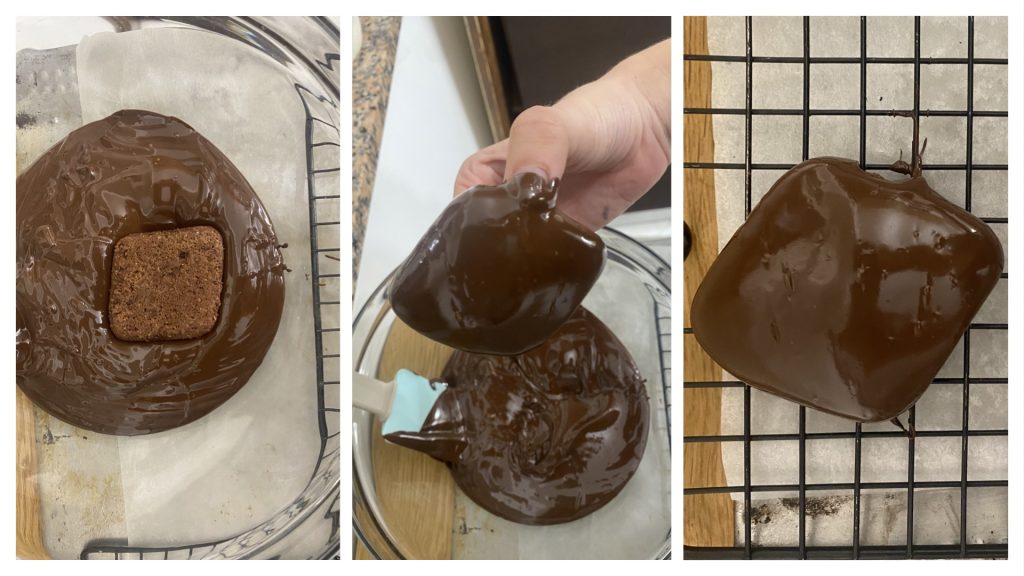 Depois que os biscoitos estiverem frios, vá coletando o chocolate derretido em uma tigela morna e mergulhe a parte superior do biscoito, deixando secar sobre uma grade para que o excesso de chocolate escorra. À medida que for procedendo, mantenha o restante do chocolate aquecido, seja no processador em movimento ou em uma tigela, mexendo frequentemente.