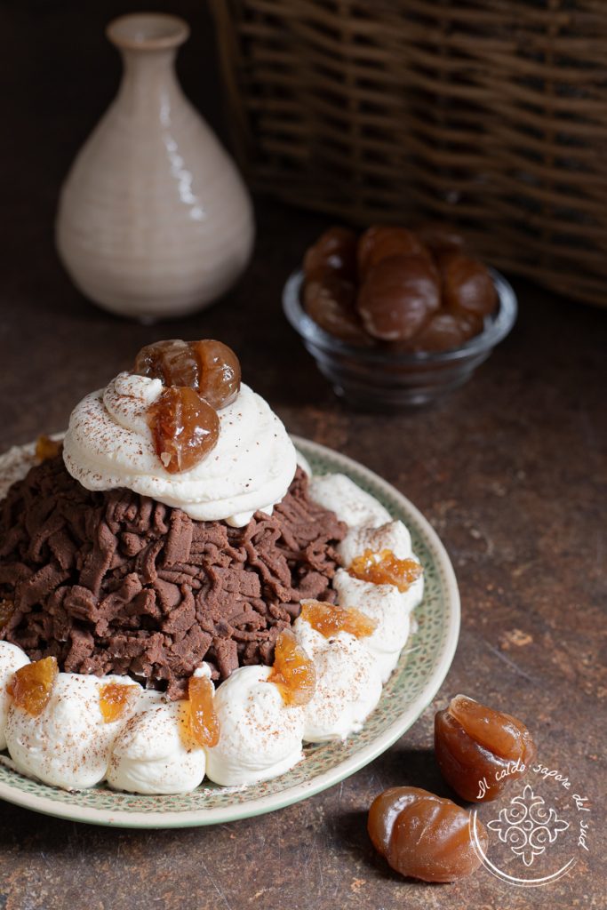 O Montebianco ou Montblanc é uma sobremesa que, muito provavelmente, tem origem francesa, conhecida sobretudo no Piemonte e na Lombardia, assim como o Bonet piemontês (receita original). Trata-se de uma sobremesa de colher, um doce preparado com castanhas cozidas no leite, que, quando ficam macias, são aromatizadas com rum e enriquecidas com cacau, transformando-se numa delícia cremosa que dá ao doce sua cor típica marrom. Para esta receita simples, mas ao mesmo tempo elegante, é aconselhável usar marrons — castanhas da variedade maior, mais doce e polposa —, mas, em alternativa, castanhas grandes também servem. O nome Montebianco (Montblanc) remete para a forma que o doce assume: decorado com bastante chantilly parece mesmo uma montanha com o topo nevado. Esta sobremesa, relativamente fácil de fazer, vai exigir apenas um pouco de paciência para descascar as castanhas; depois é só me acompanhar na cozinha e preparar junto comigo. Se quiser fazer outras receitas com castanhas, experimente a Crostata com creme de castanhas e chocolate amargo ou a Creme de castanhas com chocolate amargo; se sobrar um pouco da nossa base de castanhas, faça também os Trufas de castanha. Ah, e para deixar o Montebianco ainda mais gostoso você pode guarnecer com marrons glacê antes de servir — um verdadeiro luxo!! Antes de ir para a receita, lembro que, se quiser ficar por dentro de todas as minhas receitas, pode seguir minha página no Facebook (aqui) e meu perfil no Instagram (aqui).