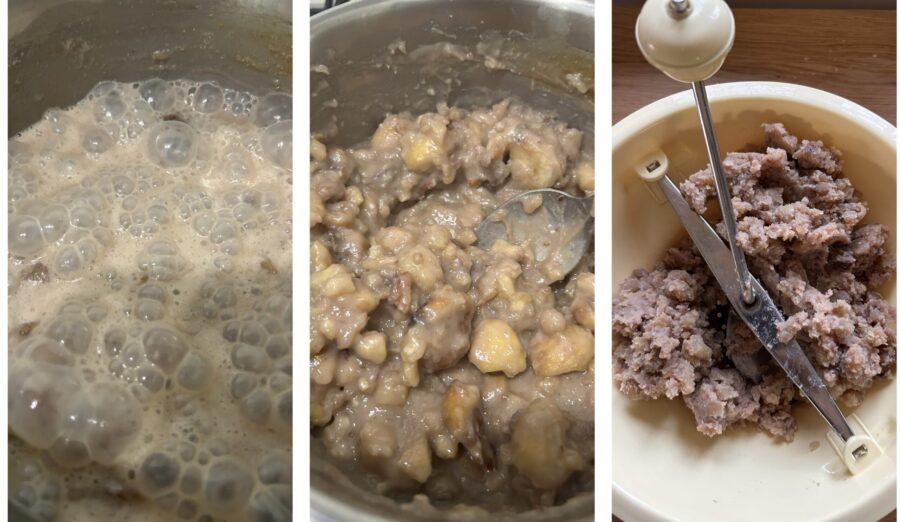 Em cerca de 30 minutos você deve conseguir; desligue o fogão e deixe amornar. Logo verá as castanhas cozidas oxidarem e escurecerem um pouco, isso é normal. Passe-as por um passa-verduras de furos médios e peneire-as — vai ser um pouco trabalhoso, mas não desista.