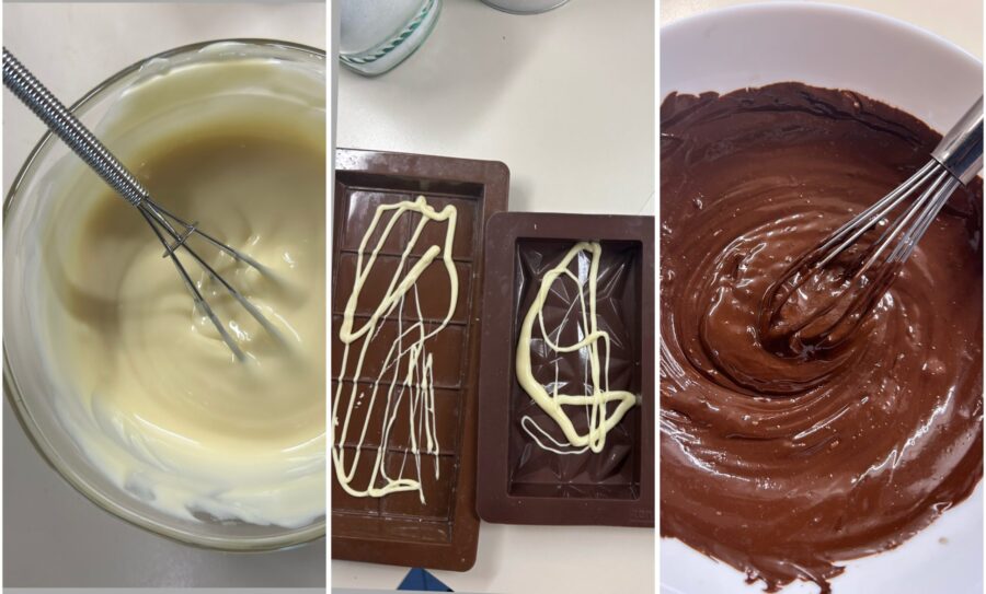 Para fazer o Dubai Chocolate, comece pelo chocolate branco, derretendo-o em banho-maria ou no micro-ondas, mexendo a cada 10 segundos para não queimar. Depois, com a ajuda de uma colher, deixe-o escorrer de forma irregular dentro de uma forma de 13,5 cm x 25 cm x 2 cm. Leve ao freezer por 5 minutos e deixe solidificar. Enquanto isso, derreta também o chocolate meio amargo, mas sem aquecer demais para não estragar e ficar opaco (31°C).