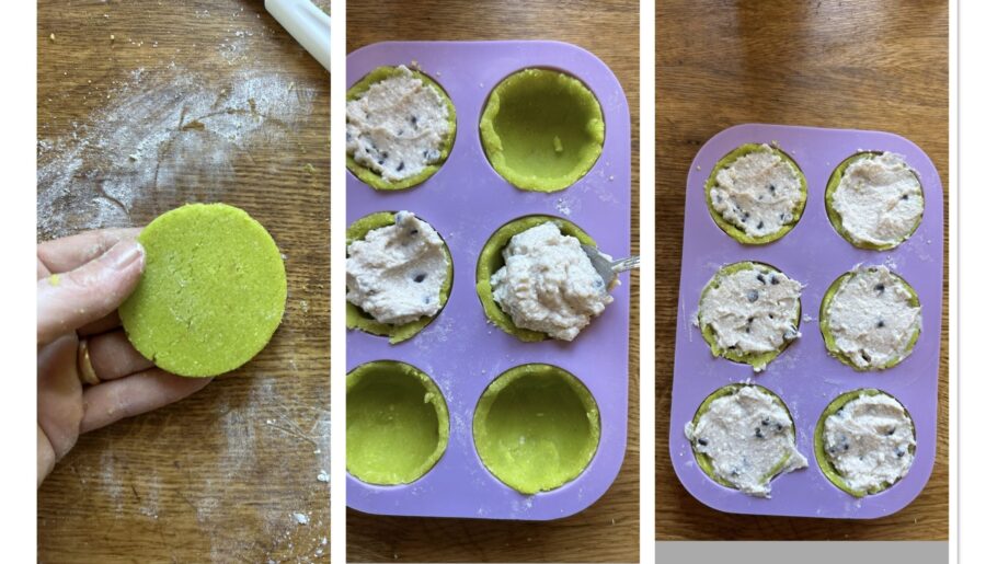 e leve ao forno a 180°C por cerca de 7 minutos, faça o teste do palito e retire. Corte pelo menos seis discos com o diâmetro das suas formas (os meus 5 cm), depois divida-os ao meio e reserve (você deve ter no final pelo menos 12 discos).